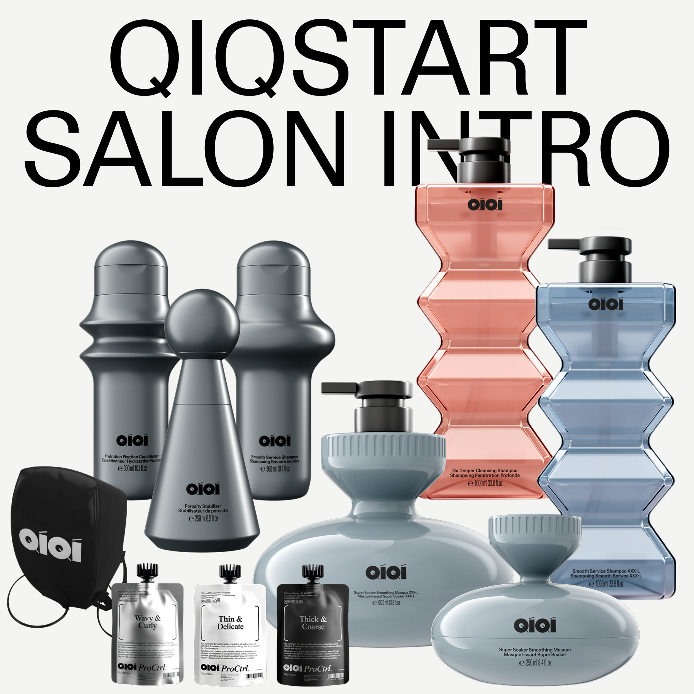1x Thin and Delicate Hair Controller 150gr. / 5.3 oz 2x Wavy and Curly Hair Controller 150gr. / 5.3 oz 3x Thick and Coarse Hair Controller 150gr. / 5.3 oz 1x Go Deeper Cleansing Shampoo 1000 ml / 33.8 fl.oz 1x Qiqi Heat Cap One Size Fits All - USA Plug 1x Smooth Service Shampoo XXX-L 1000 ml / 33.8 fl.oz 1x Super Soaker Smoothing Masque XXX-L 1000 ml / 33.8 fl.oz 3x Smooth Service Shampoo 300 ml / 10.1 fl.oz 3x Hydration Fixation Conditioner 300 ml / 10.1 fl.oz 3x Super Soaker Smoothing Masque 250 ml / 8.5 fl.oz 3x Porosity Play Spray 250 ml / 8.5 fl.oz 3x All Out Blowout 180 gr. / 6.3 fl.oz Special salon purchase: $675. Salon savings of $212. Salon value: $887 Coupon Code: QIQSTARTKIT